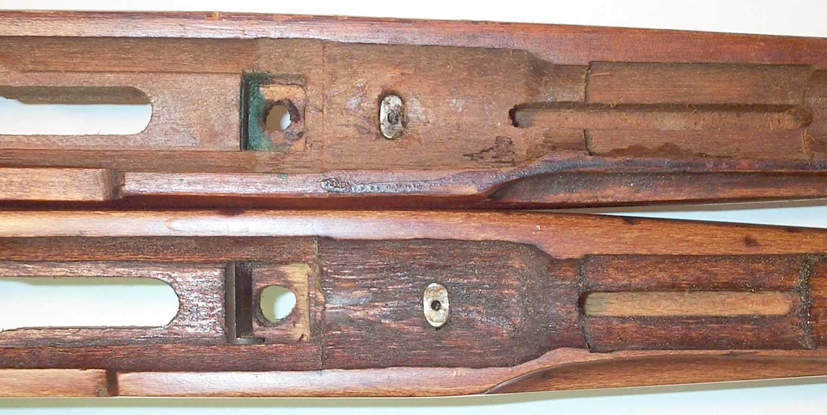Albania. The floorplate is matching with the full stamped number including the prefix. The buttplate is Izhevsk and while the numbers match, the Cyrillic prefix does not. The stock itself appears to have been sanded, has no visible cartouches, and the wood doesn't have the characteristics of a Soviet birch stock and is apparently beech. It seems to have had the standard post war pressed sling slot escutcheons at the rear at one time but they have been removed. The slot itself is approximately 3/4" farther forward than typical. The front sling slot is also bare and doesn't show evidence of an escutcheon. It is slightly closer to the rear of the stock than typical. The wrist has a circumference of 5" compared to 5 7/16" on a Soviet stock. While it seems that this stock could be dismissed as simply one that an overzealous owner decided to "improve upon", there are some characteristics that can't be explained by simple sanding and refinishing. The finger grooves are well centered on the recoil cross bolt and the bayonet groove is very pronounced at the rear but tapers almost to nothing towards the front. Soviet stock finger grooves are typically offset and the bayonet grooves are more uniform throughout their length. The rear section of the handguard is very prominent and larger than the steel endcap. The fit between the stock and the action is very sloppy with the trigger guard/magazine assembly set extremely deep. As seen in these comparison pictures the comb is shorter and has a pronounced flat spot compared to the Soviet stock in the rear. This type of comb is also found on some Chinese T53s. There are also differences in the details of the inletting with this stock showing signs of more fitting after it was finished, most notably in the area of the interrupter/ejector. This area is one where the rifle could be assembled without removing enough wood for proper function which wouldn't be apparent until test firing. The action bed itself is set much lower in the stock as seen by the exposed cross bolt. When the rifle is assembled there is no contact between the receiver and the stock except at the tang with the barrel making contact at the front. The cleaning rod nut is further forward and the cleaning rod channel "window" is much shorter. The holes for the action screws are very sloppy and the hole for the trigger is much smaller than typical with the trigger actually rubbing the sides. The relief for the floorplate latch screw at the rear of the magazine cut out is shallow and does not accommodate the screw. The floorplate pivot pin reliefs appear to have been done by hand. Individually the features of this stock could be dismissed as minor variations in production along with refinishing, but when viewed as a whole, in the context of the Chinese bolt, the odds that this stock was produced outside of the Soviet Union are great. Considering the experience that China had producing large numbers of T53 stocks and the limited experience Albania had, it seems that the latter is the most likely source. Thanks to "blacst" of Gunboards.com for selling the rifle.