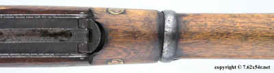 The primary modification to the rifle, which makes it an M91rv rather than a Dragoon, is the sling attachment configuration. At the butt there is a slot similar to the type found on Mauser rifles and at the fore-end there is a swivel on the left side similar to the type used later on the M27 "ski trooper" rifles. Rather than fitting through the existing slot as those did, this one is bolted through the stock slightly to the rear of the slot. Unfortunately this example was missing the backing plate for the front swivel and a replacement was fabricated from a spare buttplate. The original slots also have the the typical bolted sling hanger in the rear and a bent wire hanger in the front. These were probably added at a later date and not part of the original M91rv configuration.
